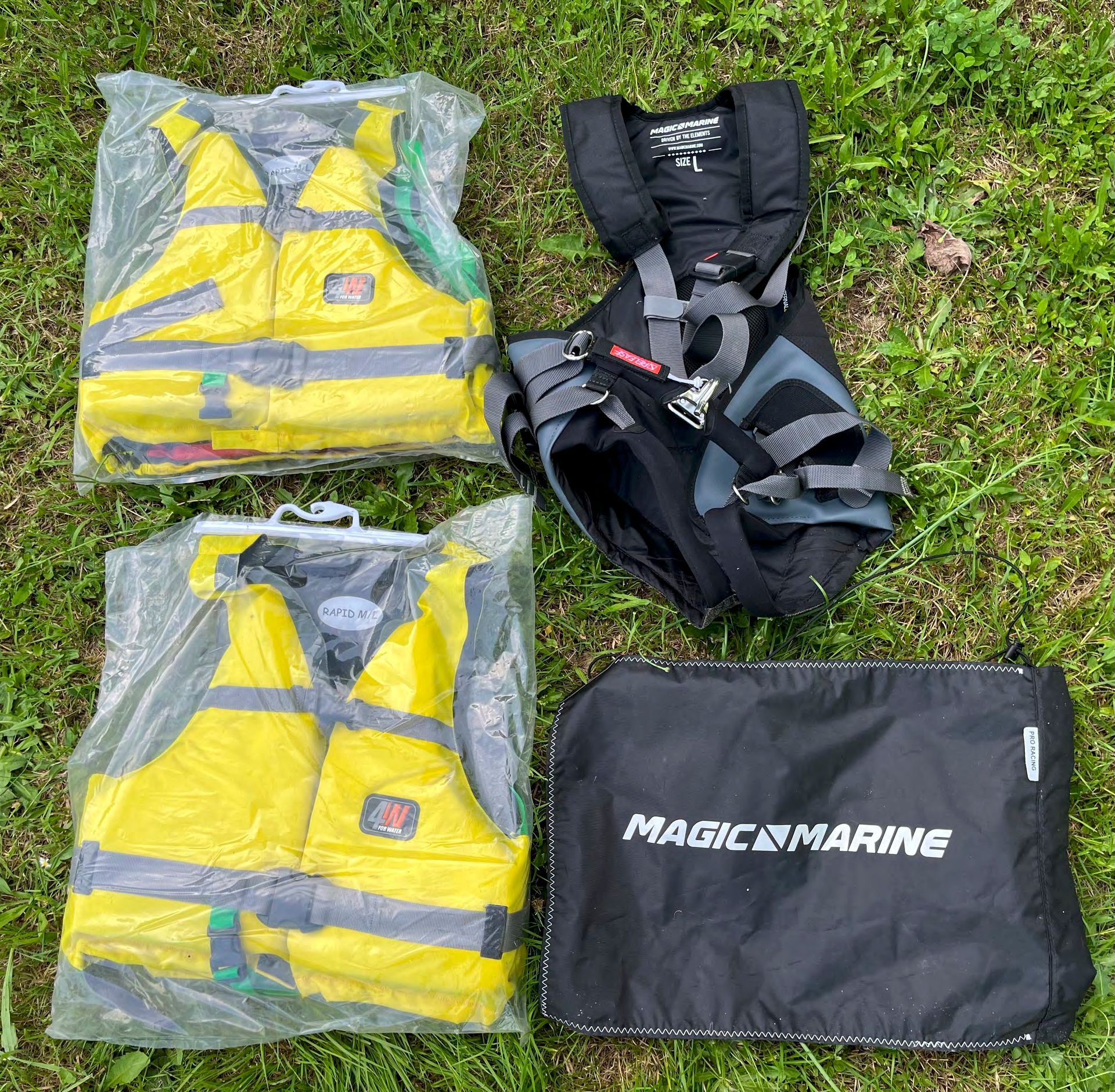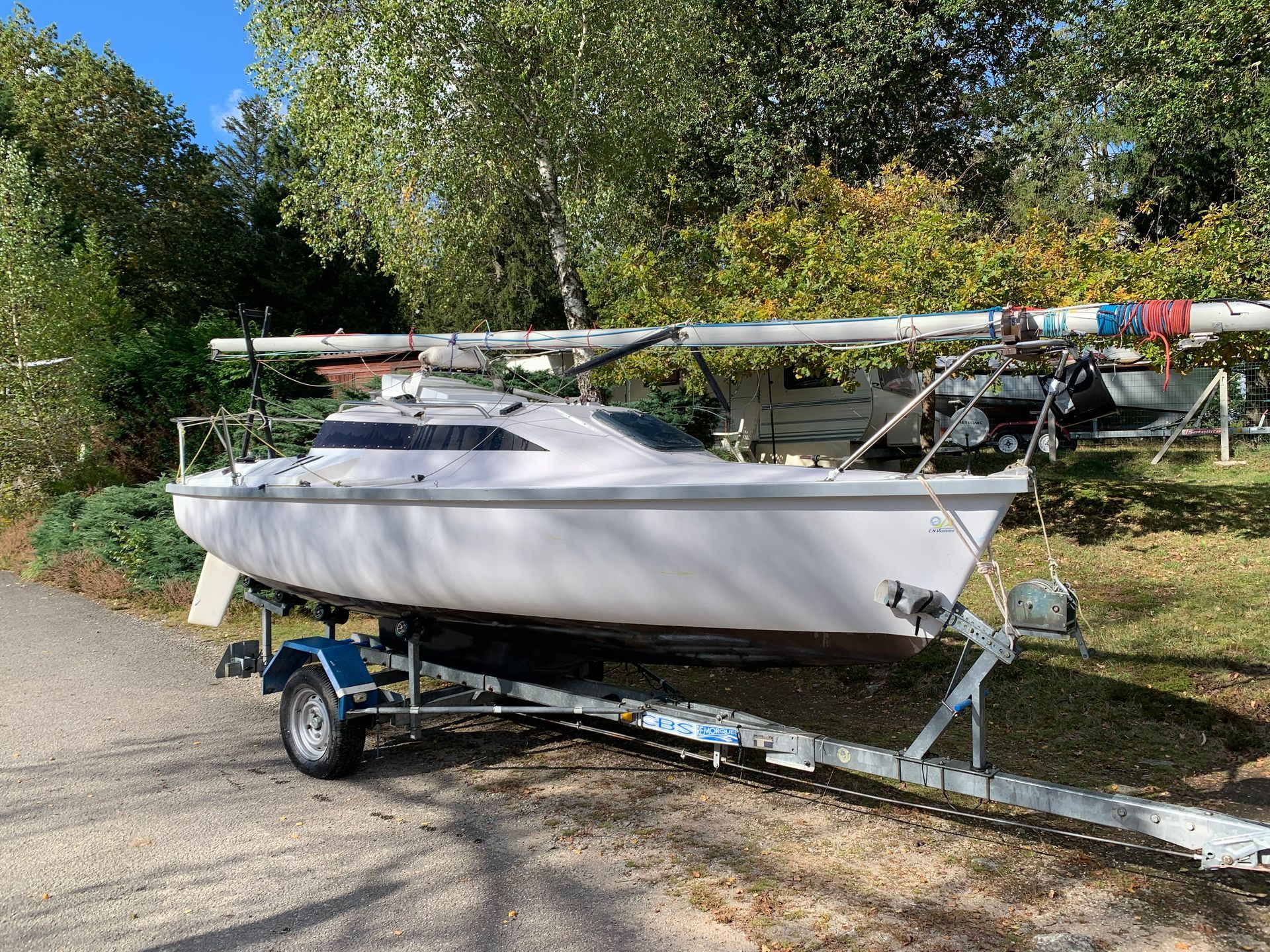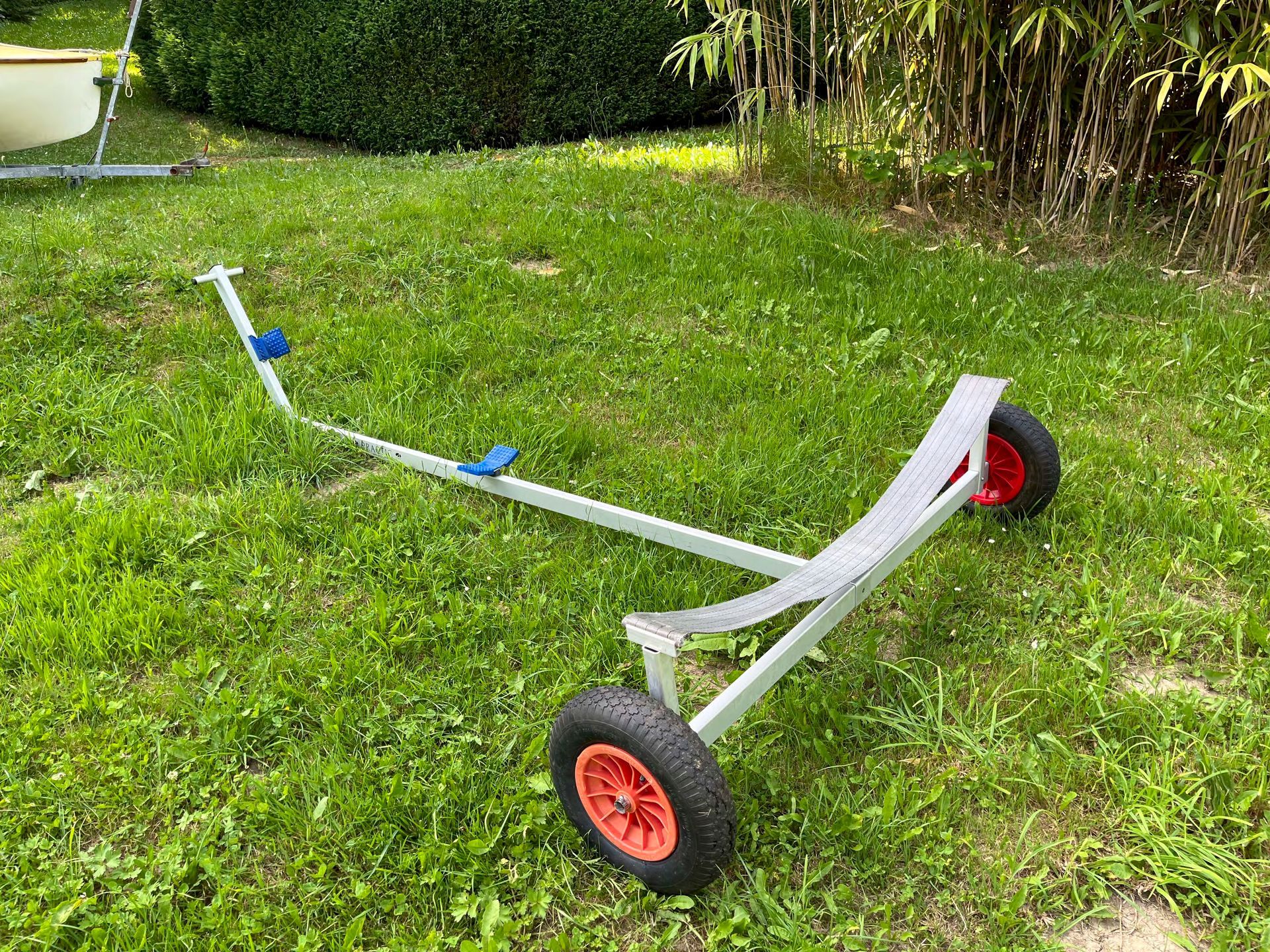 Remorque de route, remorque de plage, bâche de protection, armement complet, 2 gilets, 1 harnais de rappel, stick long pour nav en solo, pièces de rechanges, gv foc et spi en bon état, carte de circulation.